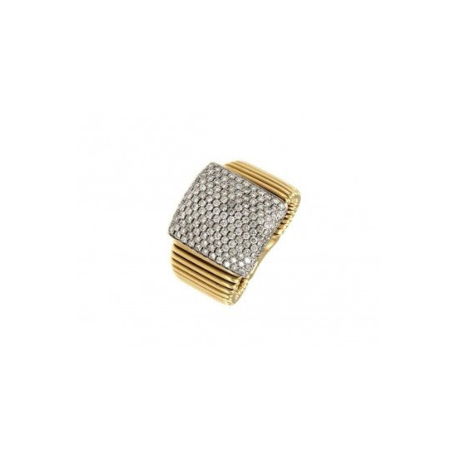 Anello in maglia Tubogas in oro giallo con piastra centrale in oro bianco e diamanti per 1,40ct. Design moderno lucidato a specchio. Anello da indossare in ogni occasione grazie al suo stile intramontabile.