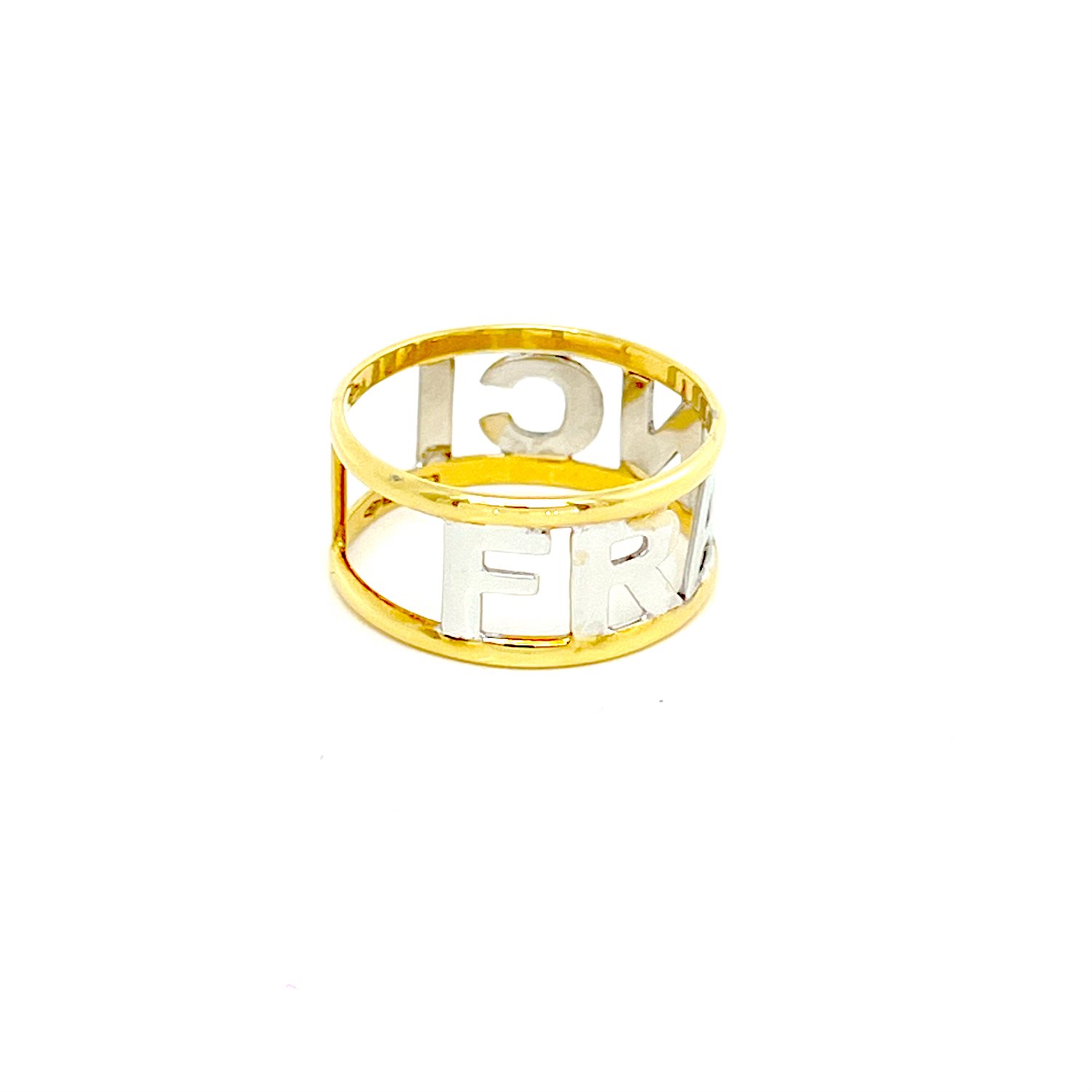 Anello donna in oro giallo 18 carati con nome “Franci” inciso in raffinato oro bianco: un gioiello unico che fonde stile, personalizzazione e pregio artigianale.