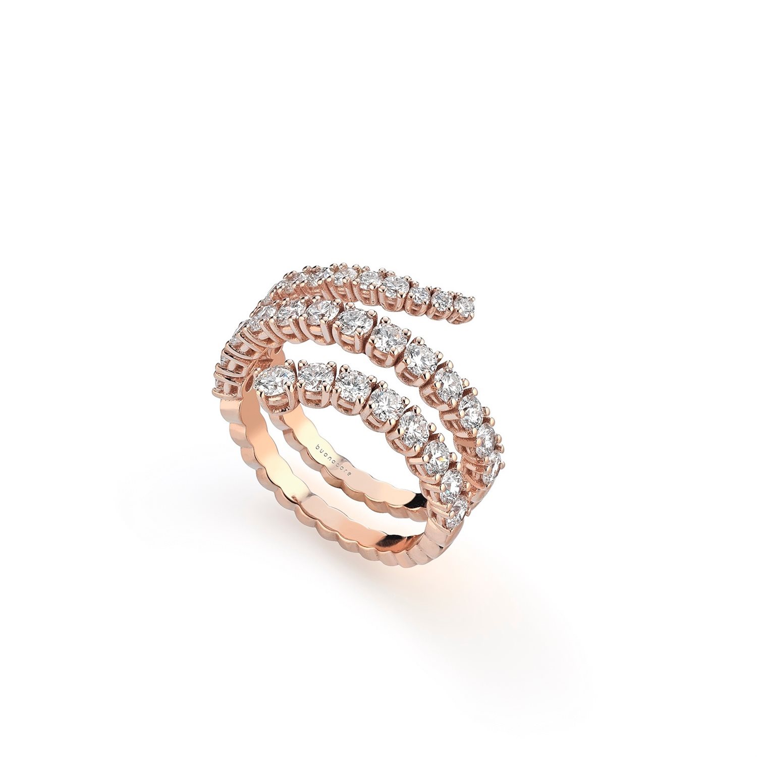 Anello in oro rosa 18 ct con fascia fantasia che percorre l’intero dito. Il design sofisticato dell’anello esalta la purezza e la brillantezza dei diamanti accuratamente selezionati, incastonati con maestria artigianale per garantire il massimo del luccichio e della durata nel tempo.