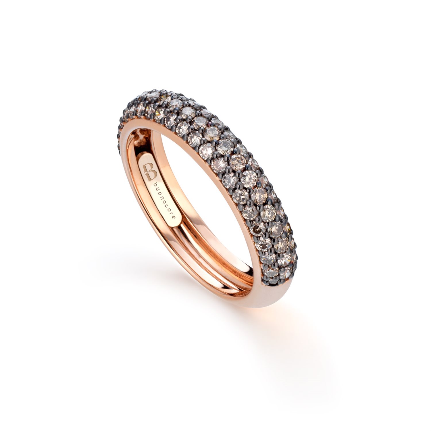 Anello fedina in oro rosa 18 carati incanta con il suo design contemporaneo e la sua preziosa lavorazione artigianale. Caratterizzato da tre file di diamanti brown disposti a mezzo giro, l’anello avvolge delicatamente il dito con un brillio caldo e sofisticato, perfetto per chi desidera un tocco di lusso discreto ma distintivo.