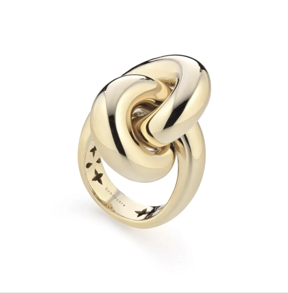 Eleganza senza tempo e maestria artigianale si fondono in questo raffinato anello in oro 18 carati della prestigiosa collezione Knot di Buonocore. Caratterizzato da un design ispirato al simbolismo del nodo—emblema di unione, continuità e legami indissolubili—questo gioiello si distingue per linee fluide e una lavorazione impeccabile, frutto dell’esperienza orafa del marchio italiano.