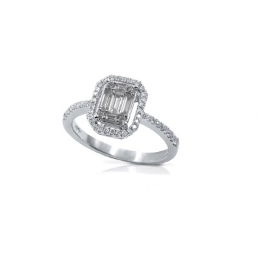 Eleganza senza tempo racchiusa in un capolavoro di gioielleria: questo raffinato anello in oro bianco 18 carati unisce la purezza del metallo prezioso alla magia della luce riflessa da pietre scintillanti. Al centro, brillanti taglio rotondo di alta qualità catturano ogni sguardo con il loro fuoco e brillantezza, mentre zaffiri o diamanti taglio baguette (a seconda della variante) incorniciano con precisione geometrica il cuore del gioiello, donando equilibrio e armonia all’insieme.