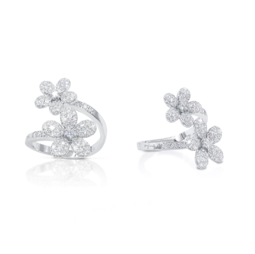 Raffinato e poetico, questo anello in oro bianco 18 carati incanta con la sua delicata armonia tra natura e luce. Il design si ispira alla bellezza eterea dei fiori, interpretata attraverso due splendidi intagli a forma di fiore, ciascuno impreziosito da brillanti taglio rotondo sapientemente incastonati a mano.