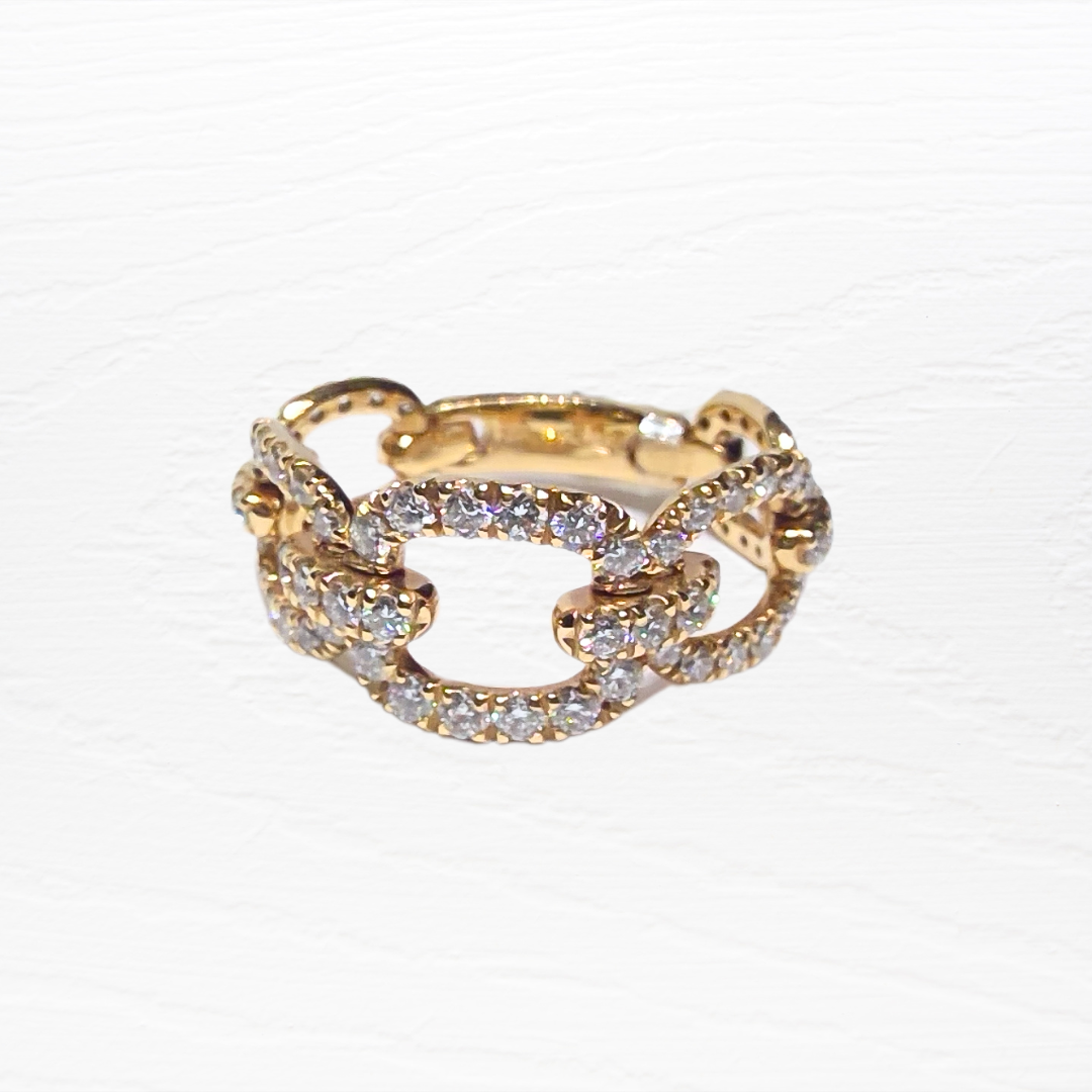 Eleganza senza tempo e raffinatezza contemporanea si fondono in questo splendido anello in oro rosa 18 carati, ispirato alla classica trama delle catene intrecciate. Il design sinuoso e dinamico riproduce fedelmente la morbida texture di una catena avvolta attorno al dito, donando movimento e luminosità a ogni gesto.