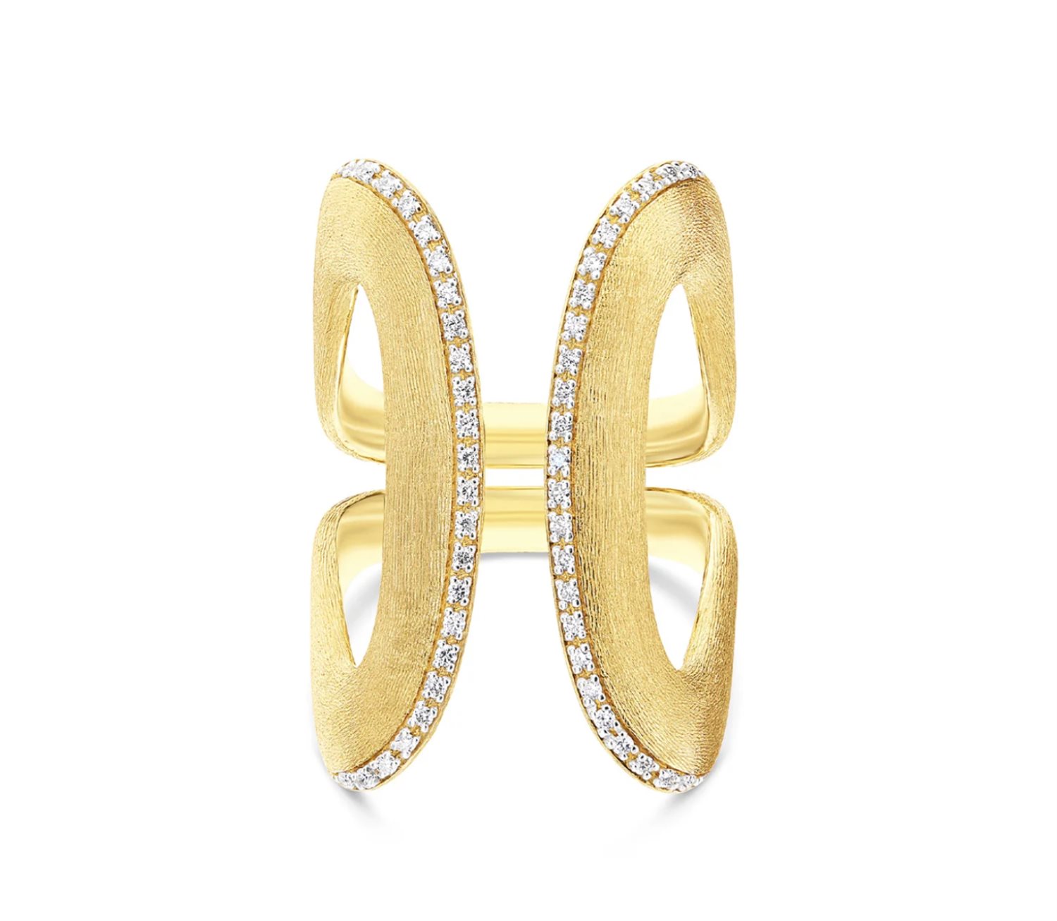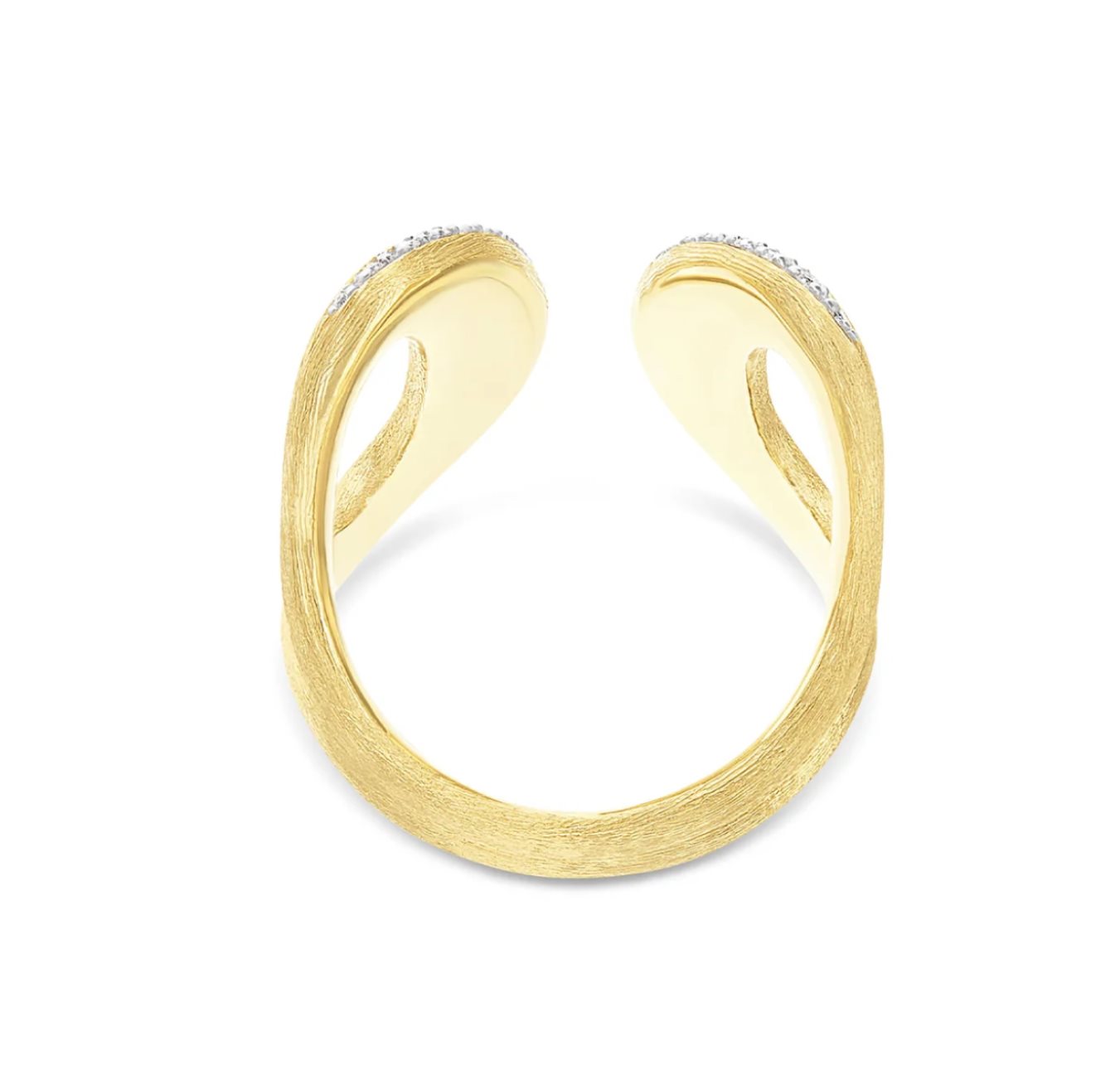 Una geometria sinuosa e nuova contraddistingue questo anello in oro 18kt e diamanti, che sembra adagiarsi sulla mano come una farfalla. Un piccolo capolavoro di artigianalità della collezione ICON.