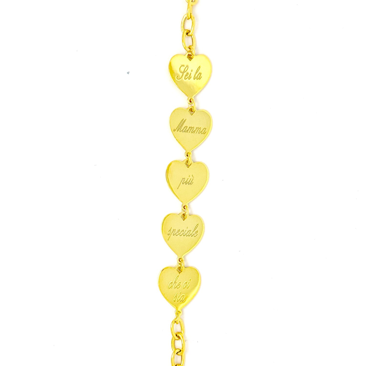 Realizzato a mano con cura artigianale da Cikorefice Gioielli, questo bracciale multicuore è l’omaggio perfetto per celebrare la figura straordinaria di una mamma. Realizzato in argento 925 dorato, elegante e resistente, ogni singolo cuore – delicatamente modellato e lucidato a mano – porta incisa con precisione la dolce frase: