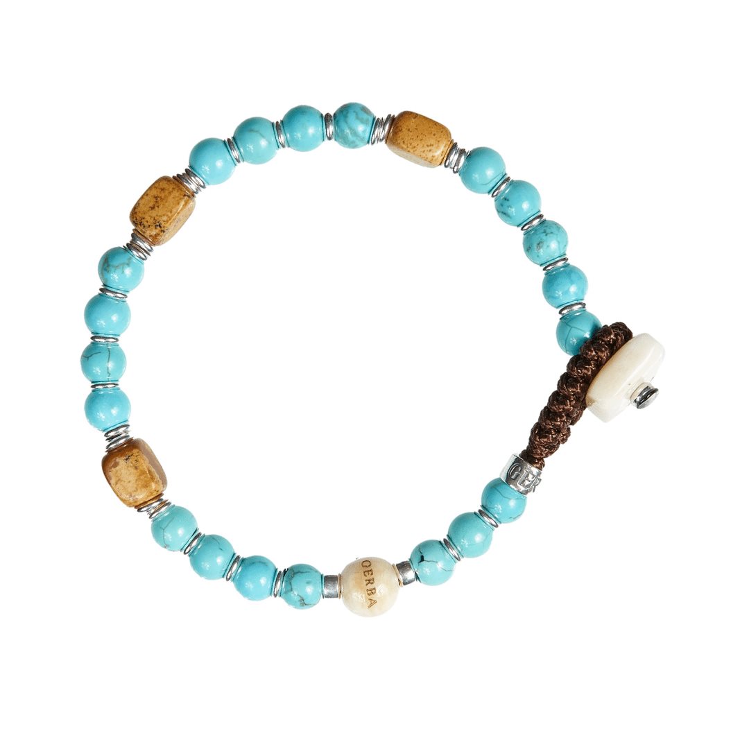 Il bracciale Gerba Strange Stone 01 si distingue per il suo design particolare, composto da pietra aulite celeste e sassi in pietra paesina, pallina Gerba e bottone in osso, e componenti in Argento 925.