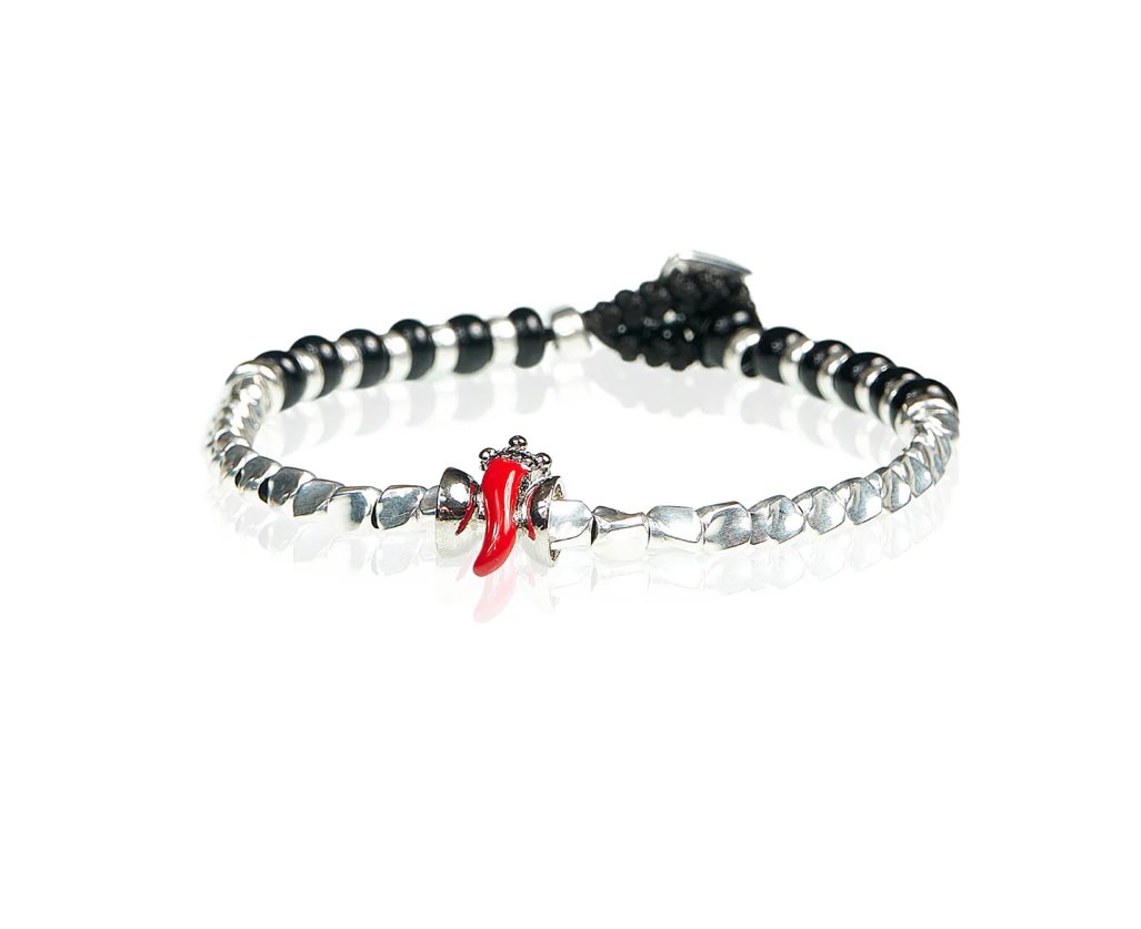 Bracciale Horn Silver HS01 realizzato in argento 925 con corno in bronzo smaltato rosso e murrine. Emblema di bellezza, eleganza e raffinatezza, tale prodotto è perfetto per essere sfoggiato nelle più disparate occasioni, un evento particolarmente elegante o quotidianamente grazie al suo design moderno e minimalista.