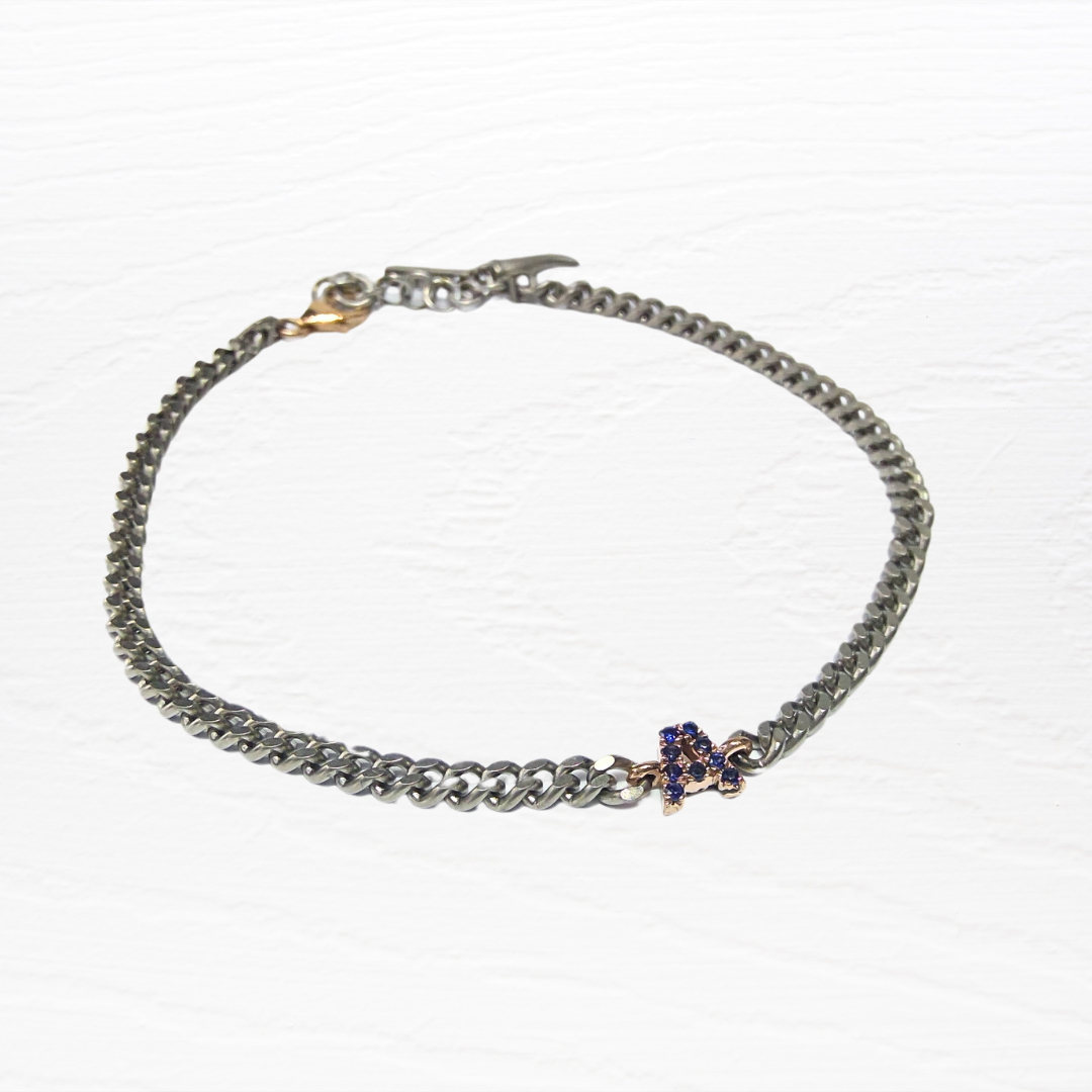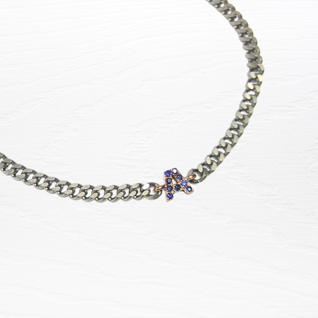 Bracciale in Titanio con catena groumette con lettera A in oro rosa 9ct e zirconio blue con moschettone in oro rosa 9ct.