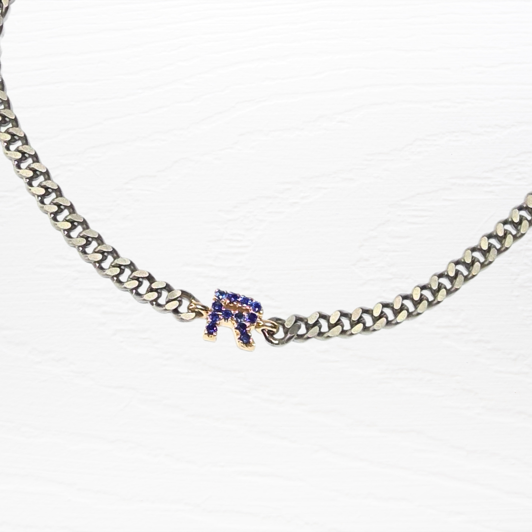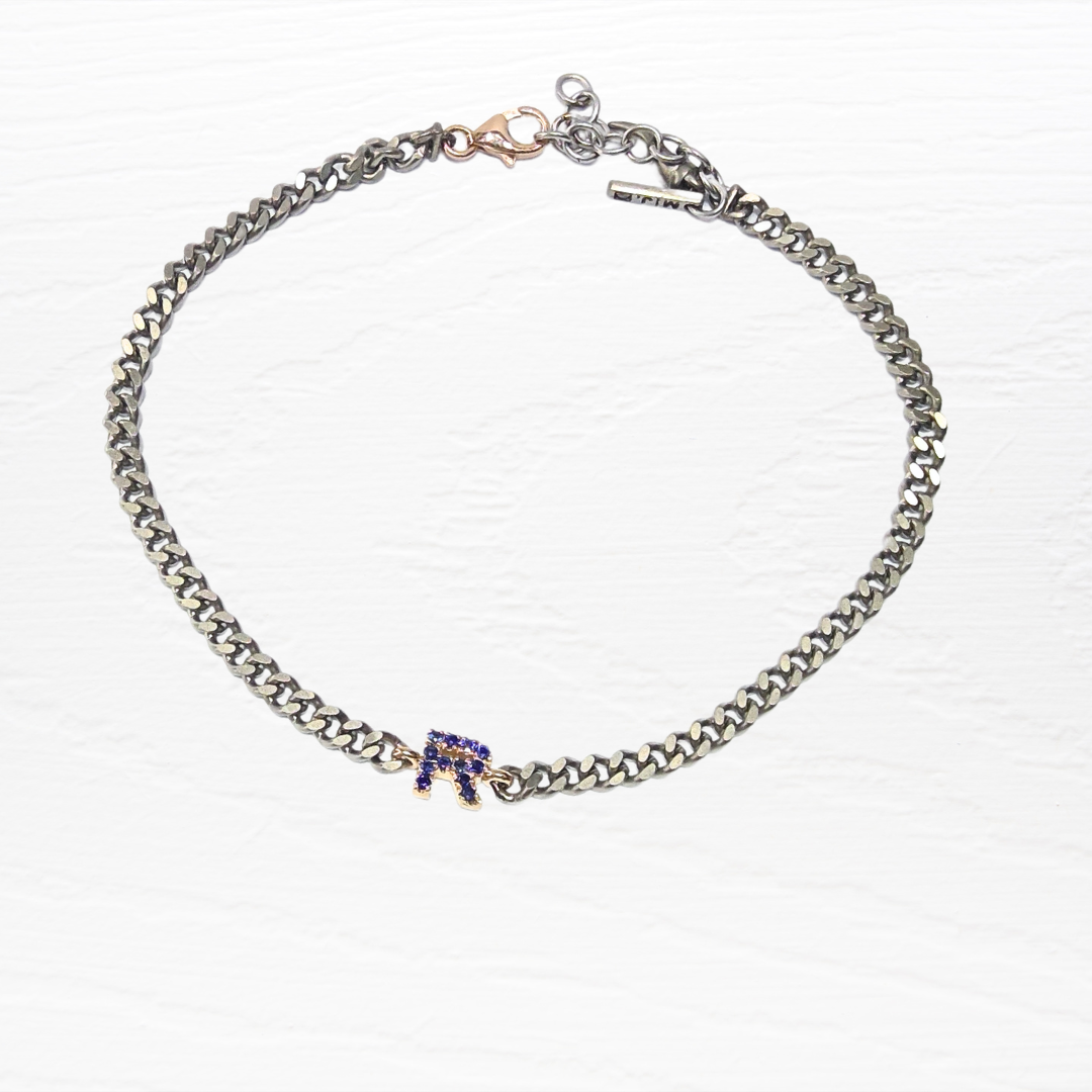 Bracciale in Titanio con catena groumette con lettera R in oro rosa 9ct e zirconio blue con moschettone in oro rosa 9ct.