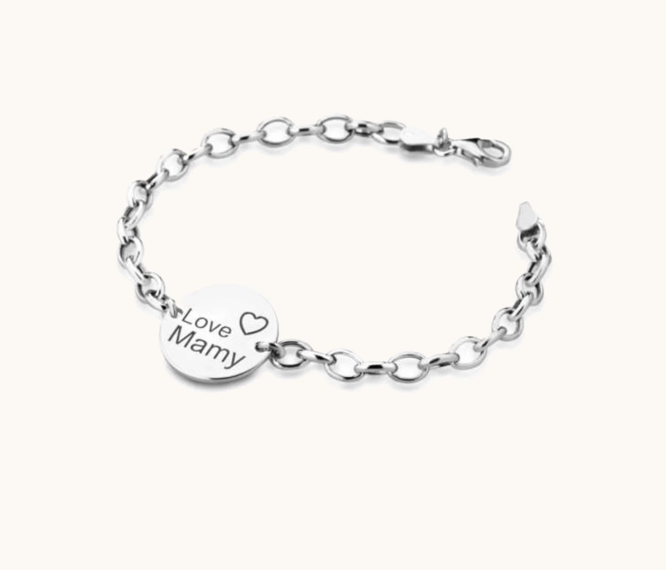 Bracciale in argento con una medaglina lucida su cui è inciso “Love Mamy” con un elegante font. Il design semplice ma significativo rende questo gioiello un dolce omaggio, perfetto per celebrare l’amore e il legame speciale con la figura materna. Un accessorio discreto e raffinato, ideale per portare sempre con sé un messaggio di affetto.