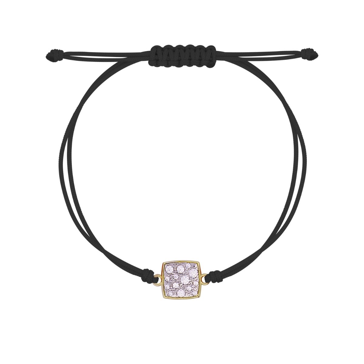 Bracciale della collezione Rue Des Mille Stardust Ten da donna. Colore: nero e oro. Il gioiello è composto da un doppio cordino nero e da un ciondolo passante quadrato in argento 925‰ con galvanica in oro giallo 18Kt con pavé di zirconi. Chiusura regolabile.