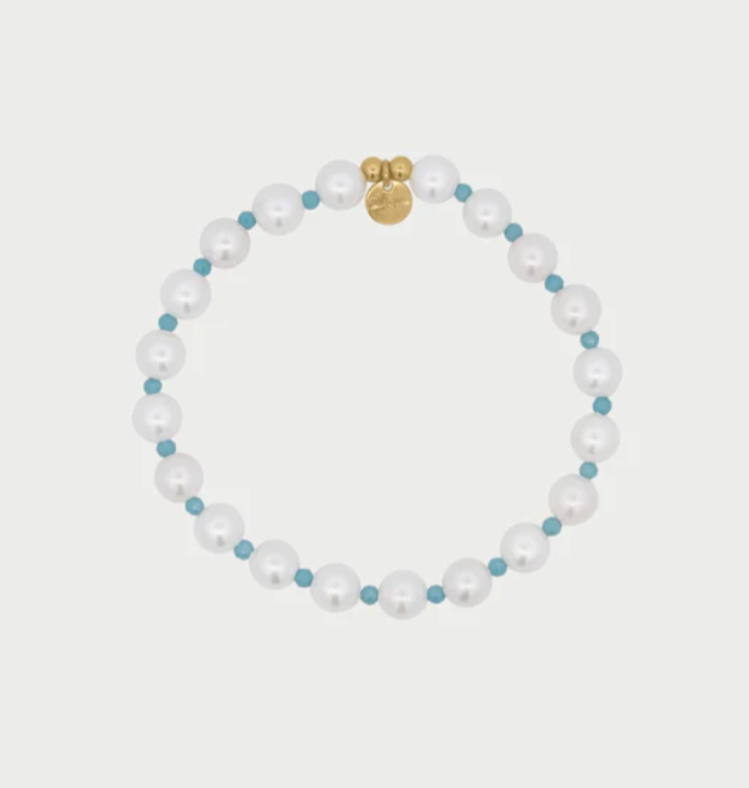 Bracciale Base in Perle di Madreperla con zirconi Milky turchesi, elastico e regolabile. Elegante e perfetto come base per charms o da indossare da solo.