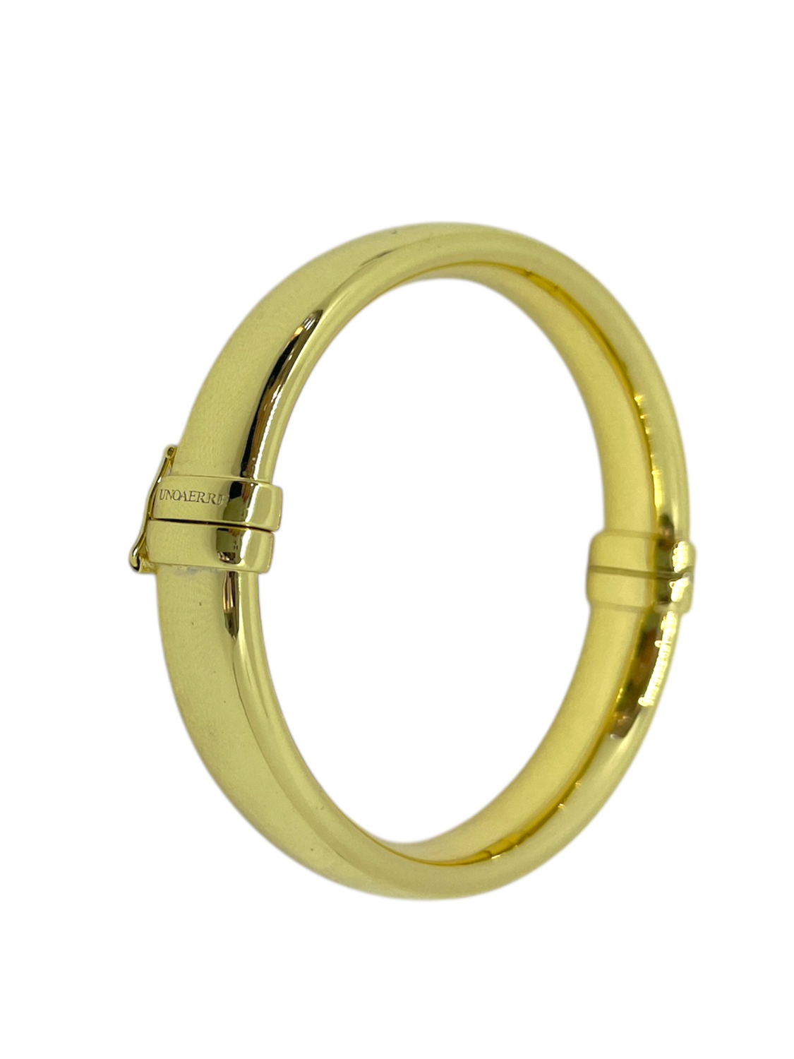 Bracciale rigido a manetta in bronzo con placcatura in oro giallo e finitura lucida. Diametro 19 cm.
