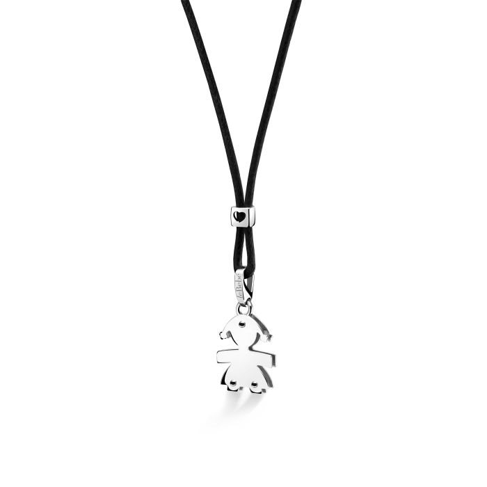 Ciondolo con sagoma femminuccia in oro bianco , altezza 1,40 cm. larghezza 1,20 cm., cordino color nero e distanziatore in oro bianco con cuoricino traforato.