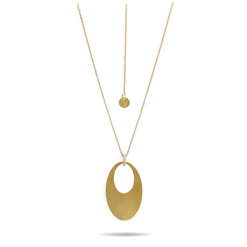 Collana in AG 925‰ placcato oro giallo 23 ct, con elemento pendente ovale satinato a mano e legato alla catena tramite una rondella di cubic zirconia bianchi. Cm 42 + ext