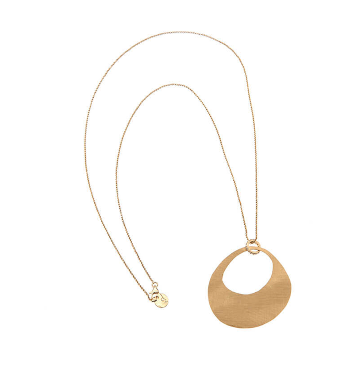 Collana in AG 925‰ placcato oro giallo 23 ct, con elemento pendente satinato a mano e legato alla catena tramite una rondella di cubic zirconia bianchi. Cm 42 + ext