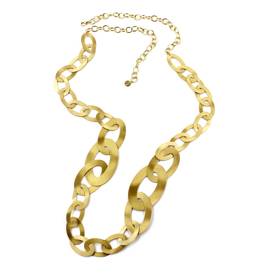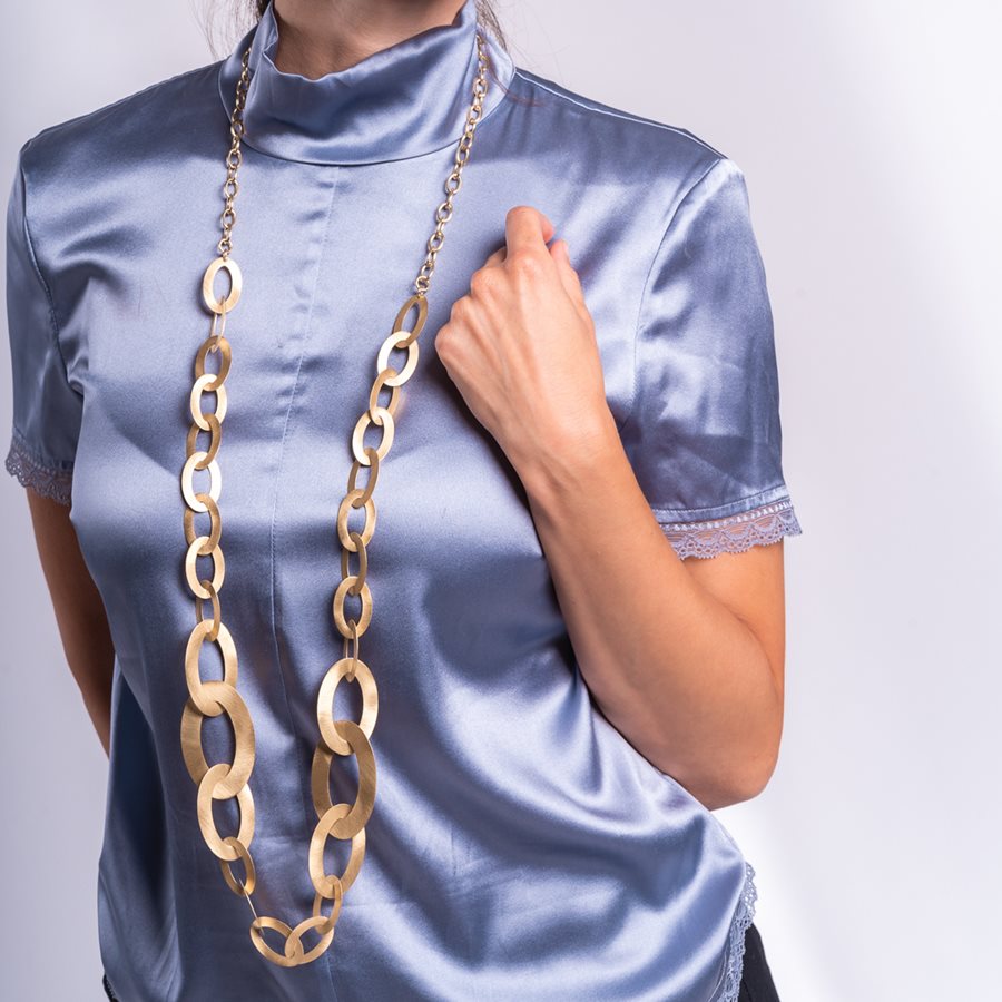 Maxi collana con elementi ovali intrecciati in AG 925‰ placcato oro giallo 23 ct, satinato a mano. Cm 115