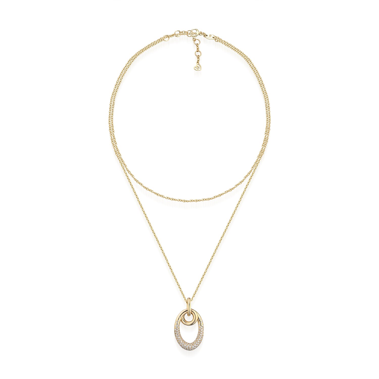 Realizzata in oro giallo 18 carati (15,00 grammi), la catena avvolge delicatamente il collo con un design fluido e armonioso, mentre il pendente a forma di loop – iconico della collezione – cattura l’attenzione con la sua geometria essenziale e moderna. Al centro del pendente, diamanti bianchi di taglio brillante, per un totale di 0,86 carati, esaltano la luce naturale con ogni movimento, regalando scintillii intensi e puri.
