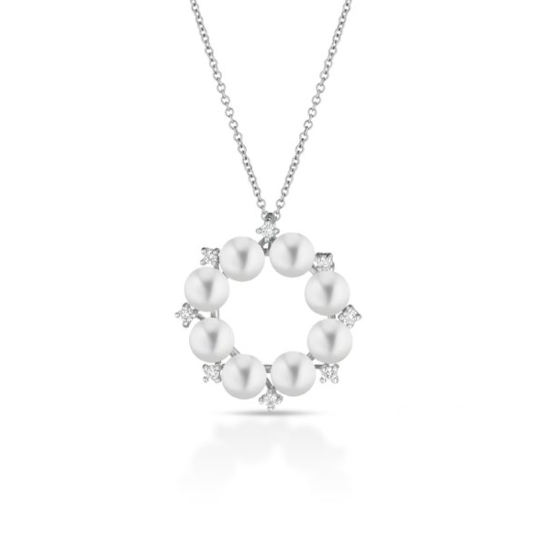 Eleganza, lusso e femminilità si fondono in questa straordinaria collana realizzata in oro bianco 18 carati, un gioiello che incanta con la sua raffinata semplicità e il tocco romantico delle perle disposte a formare un delicato effetto fiore. Al centro del design, diamanti naturali dal taglio impeccabile, con un peso totale di 0,06 carati, catturano la luce con ogni movimento, aggiungendo brillantezza e sofisticazione all’intera creazione.