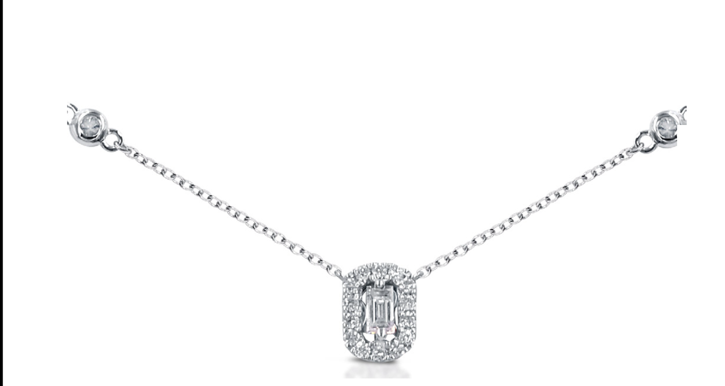 COLLANA CON PENDENTE MULTIPIETRA FORMA SMERALDO E PUNTI LUCE SU CATENA