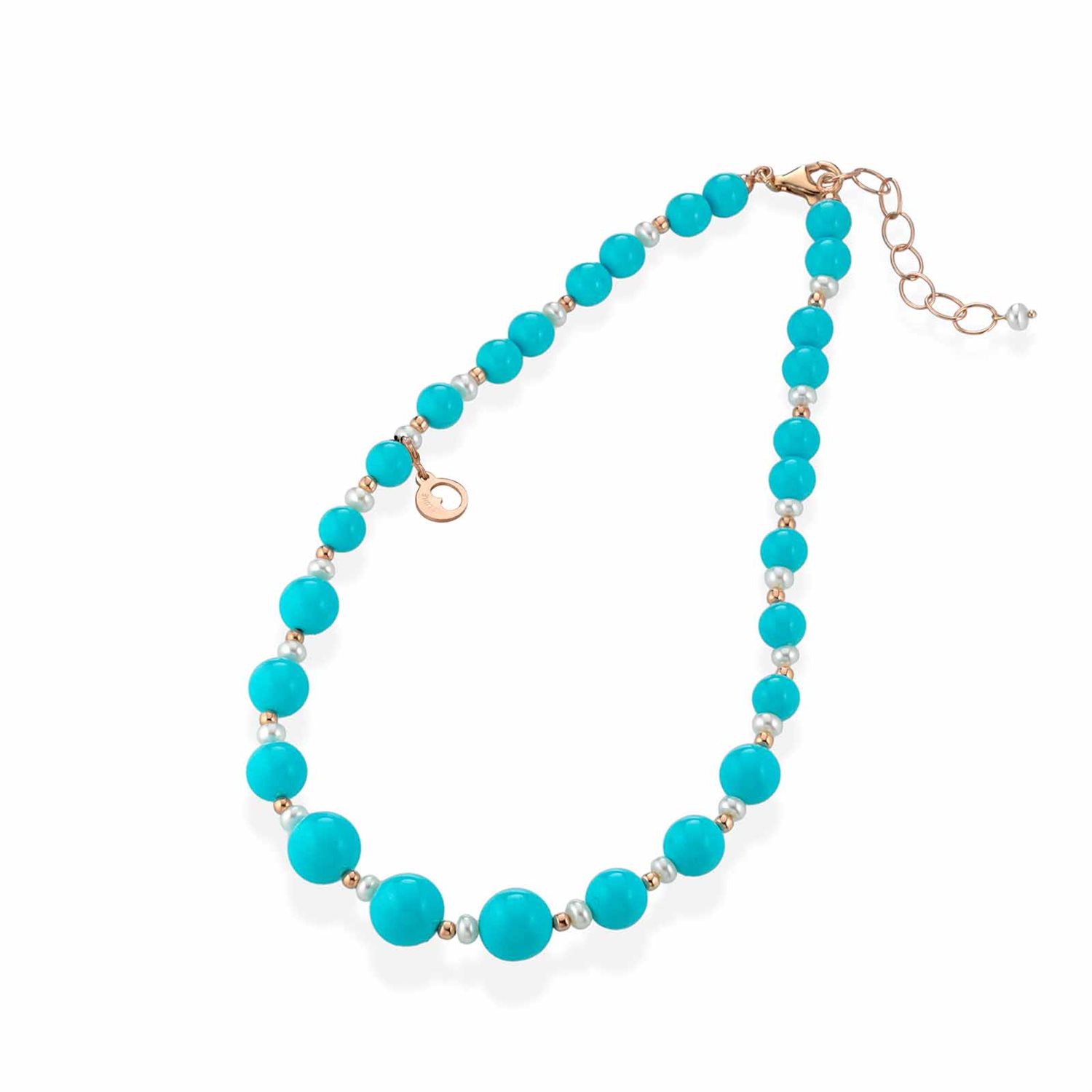 Collana in pasta di turchese con argento rosa e perle d’acqua dolce