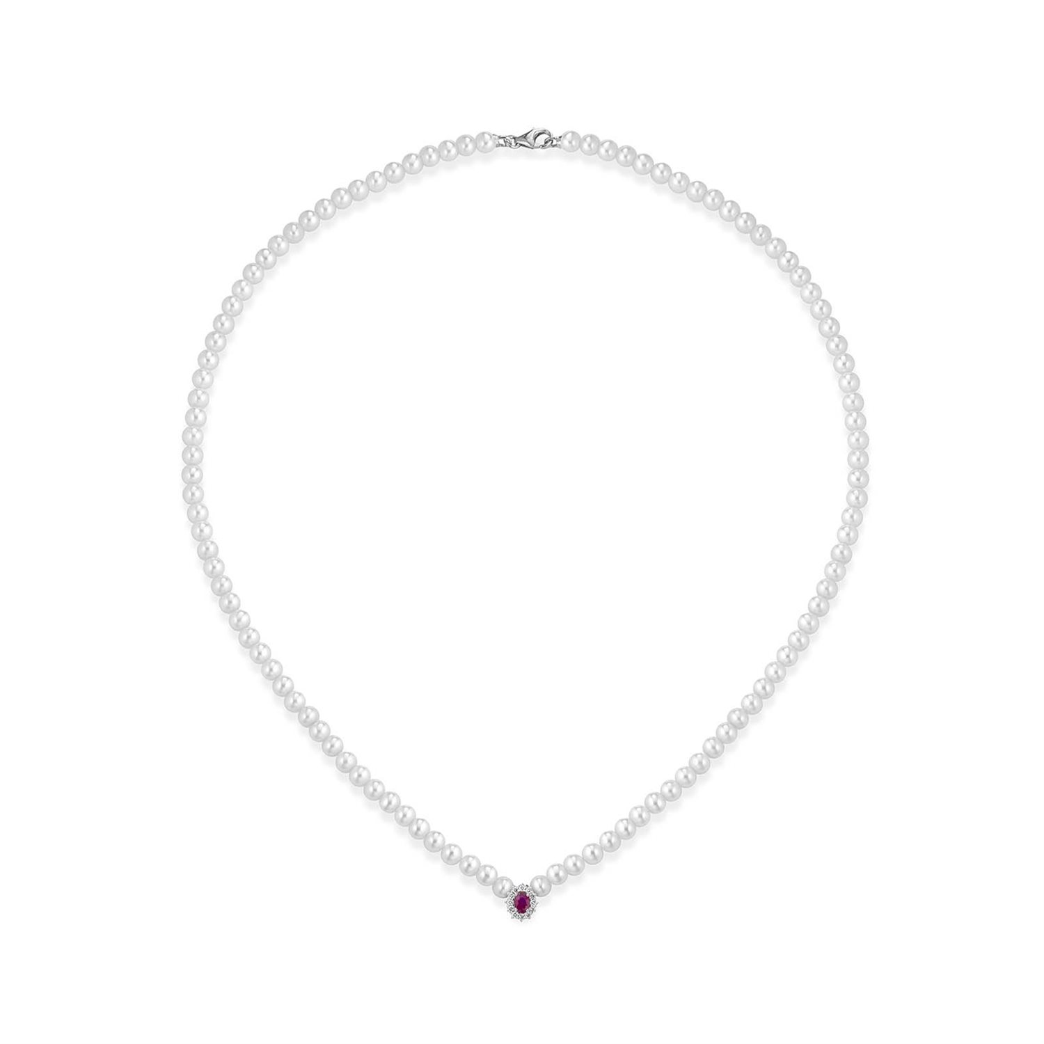 COLLANA CON PERLE CON RUBINO E DIAMANTI CENTRALE CON CHISURA IN ORO BIANCO 18CT