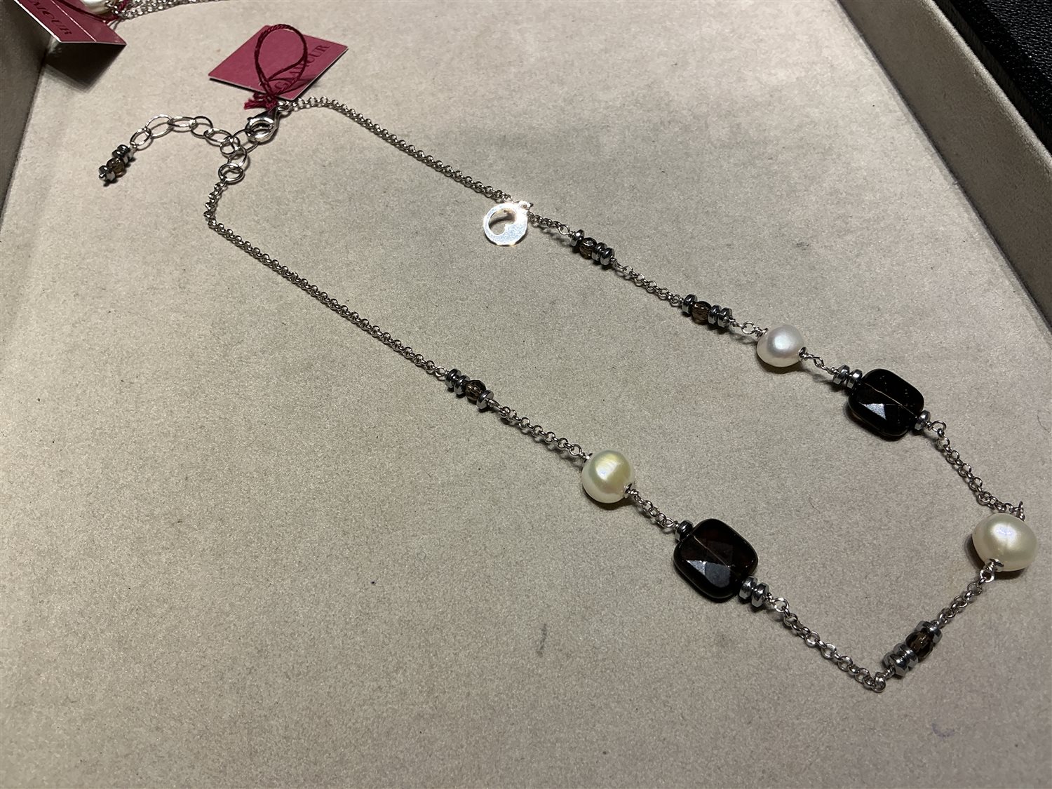 Collana in AG925, perle FW, ema. e quarzo fumè 45 cm.