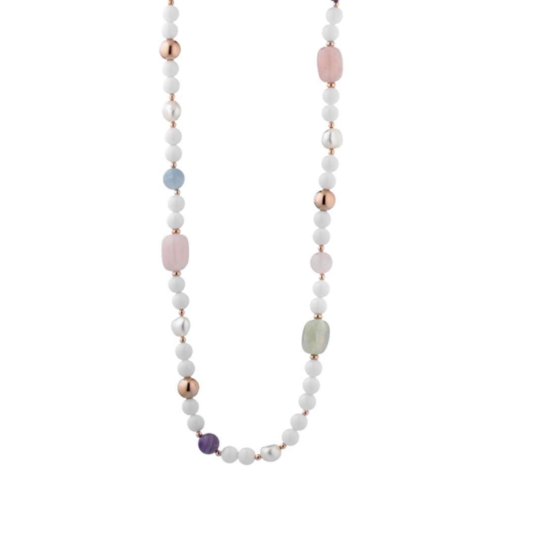 Eleganza senza tempo incontra energia naturale in questa splendida collana artigianale, un vero e proprio talismano di bellezza e armonia. Realizzata a mano con cura artigianale, la collana unisce perle dalla lucentezza morbida e setosa a pietre naturali scelte per le loro proprietà cromatiche e simboliche: l’ametista, con il suo viola profondo, simbolo di intuizione e serenità; l’agata rosa, portatrice di dolcezza e amore; e l’acquamarina milk, con la sua tonalità cristallina e avvolgente, evocatrice di pace e chiarezza interiore.