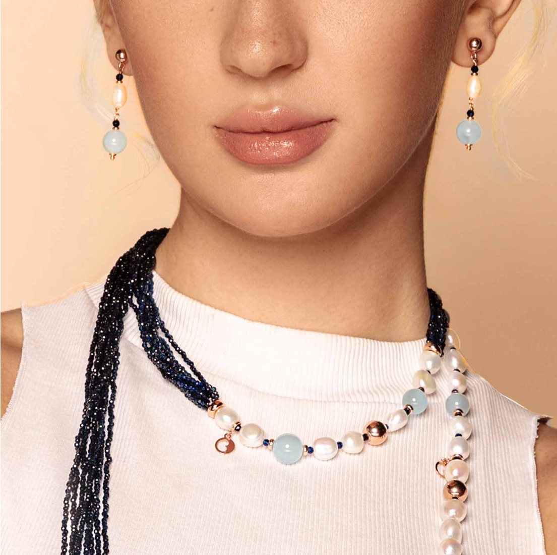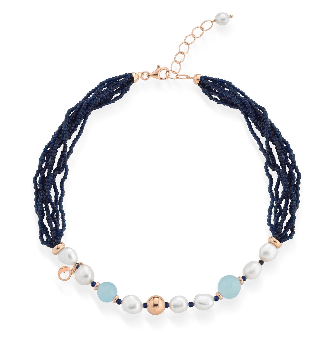 Collana con perle d’acqua dolce, AG925 rosa, spinello blu e giada azzurra