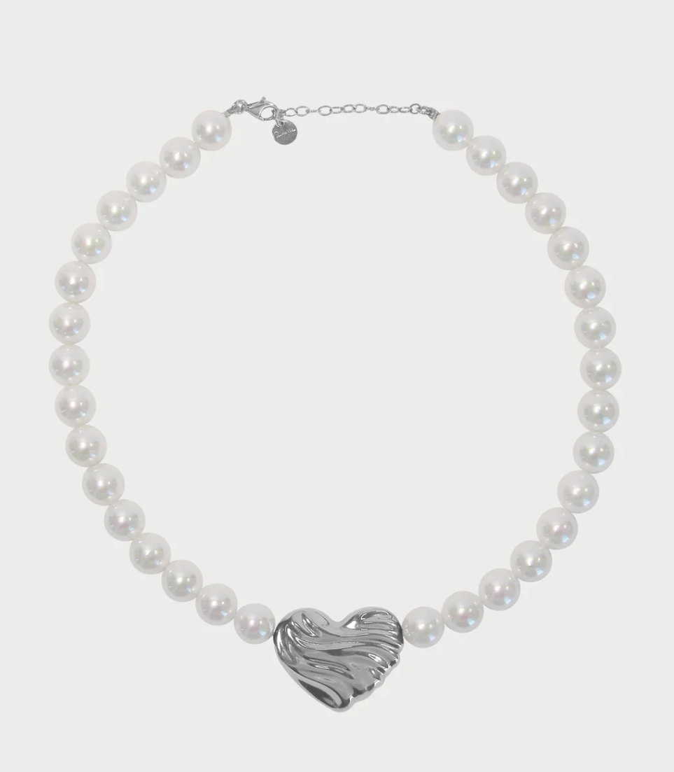 Girocollo con perle di madreperla e cuore con texture a onda. In lega RDM, finitura oro 18 kt giallo o rodio. Eleganza luminosa e contemporanea.