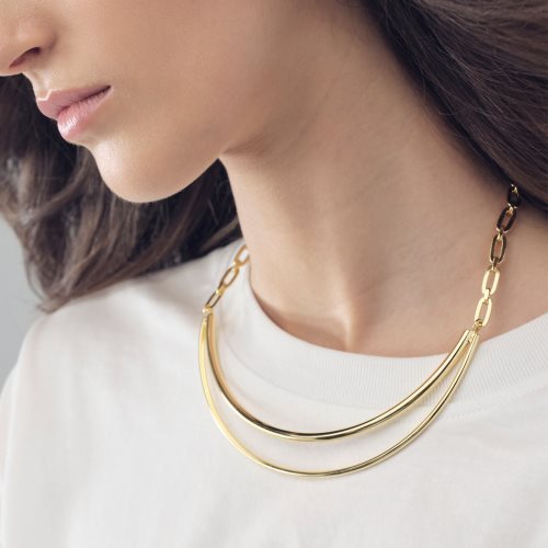Collana con doppio filo rigido e catena forzatina, misura 39,00 cm. Un mix and match di stili per un eleganza dal gusto contemporaneo ed essenziale. Tradizione orafa e design innovativo s’incontrano e coesistono in perfetta armonia in un gioiello che anche da solo può costruire un look. Scopri la collezione Line ed abbina la collana ai gioielli coordinati.