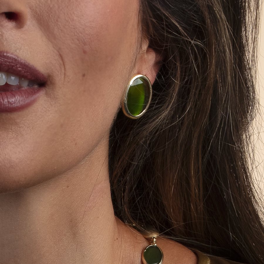 Orecchini a lobo in AG 925‰ placcato oro giallo 23 kt. con pasta vitrea Verde occhio di gatto