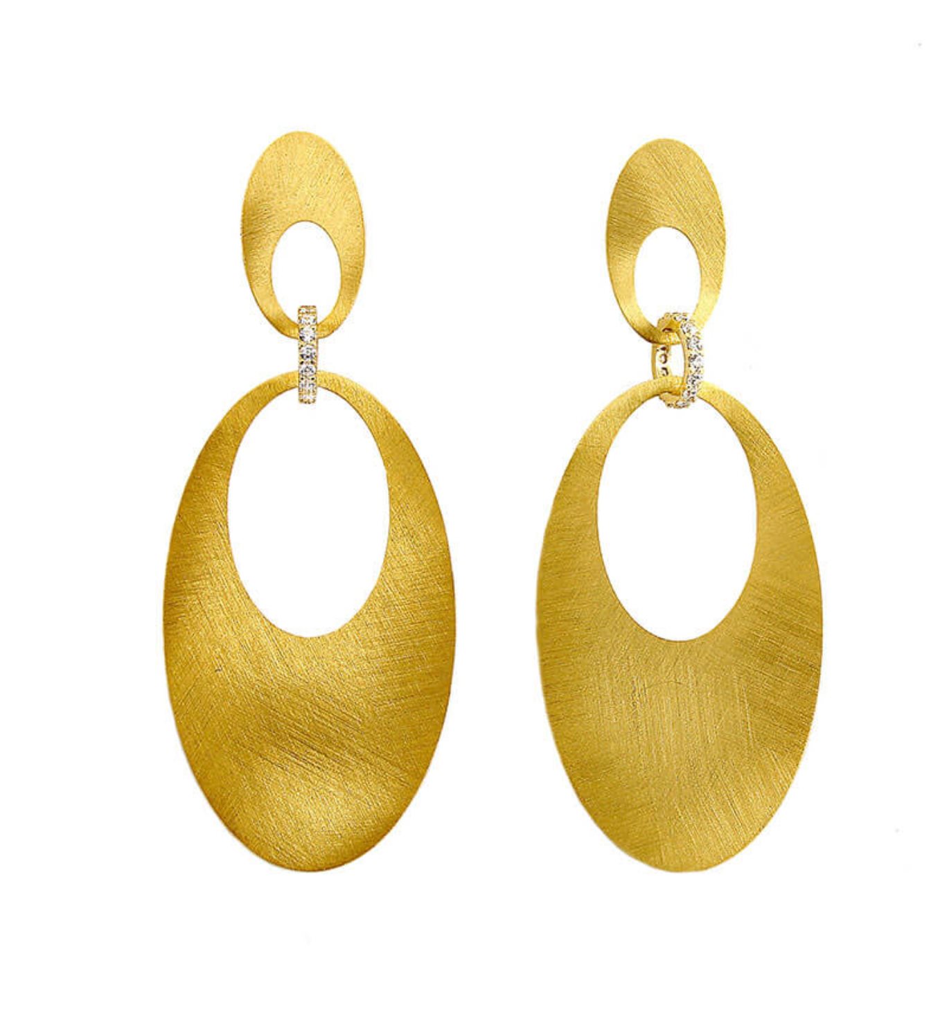 Maxi orecchini con due elementi ovali, tagliati su foglio d’argento 925‰ placcato oro giallo 23 ct, e tenuti insieme da rondelle di cubic zirconia. Cm 7