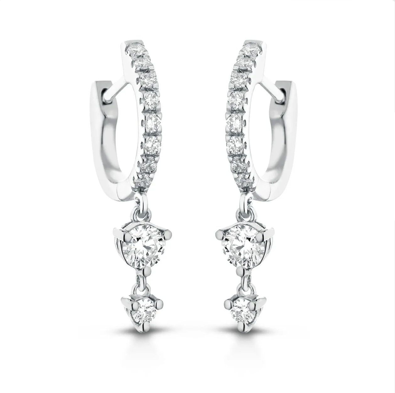Il design classico del cerchio si arricchisce di un dettaglio luminoso: una delicata fila di diamanti incastonati lungo il profilo superiore, che catturano la luce con ogni movimento. A completare lo stile, un raffinato “punto luce” pendente—un solitario diamante montato in modo da oscillare dolcemente—aggiunge un tocco di movimento e brillantezza extra.