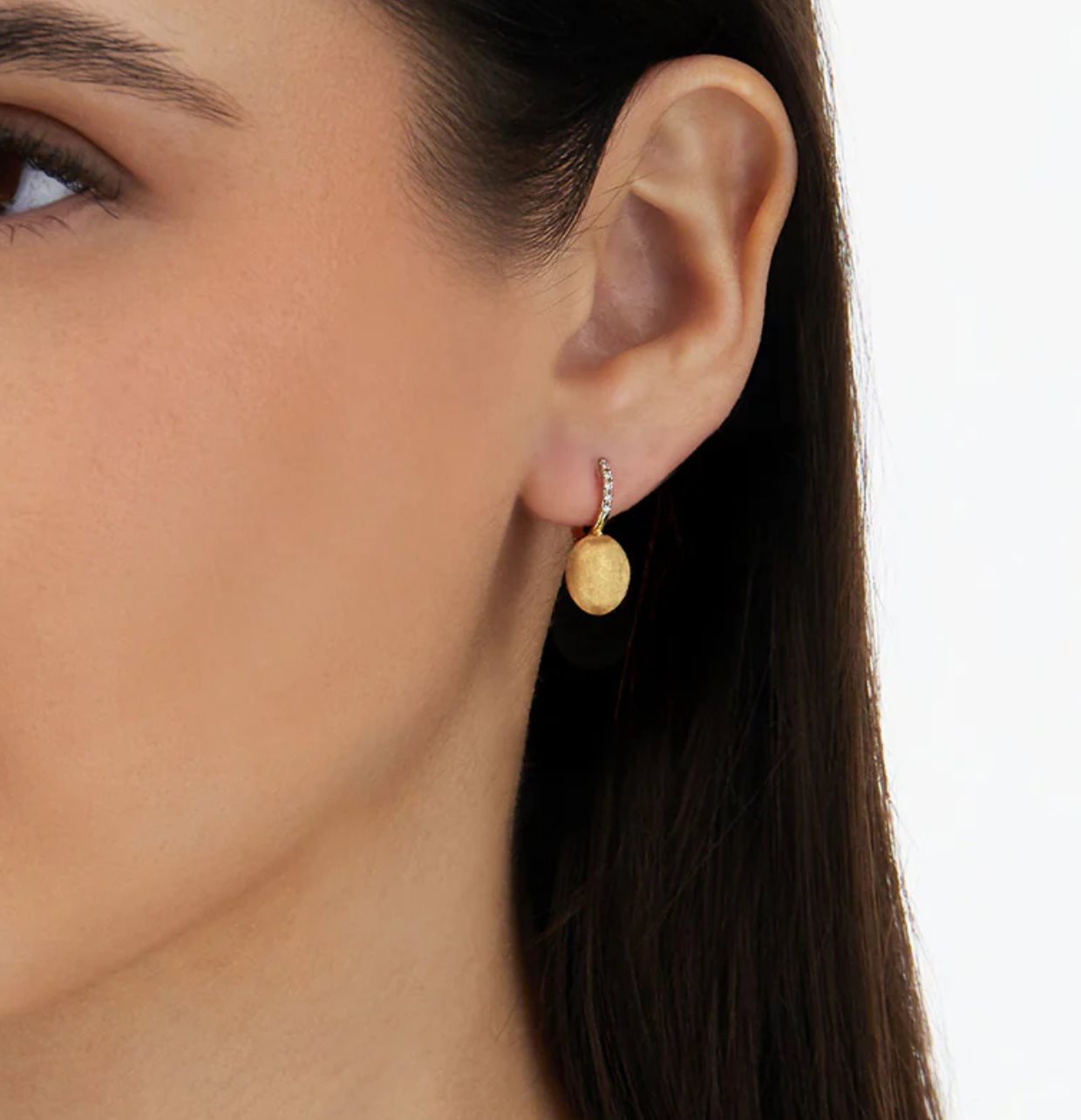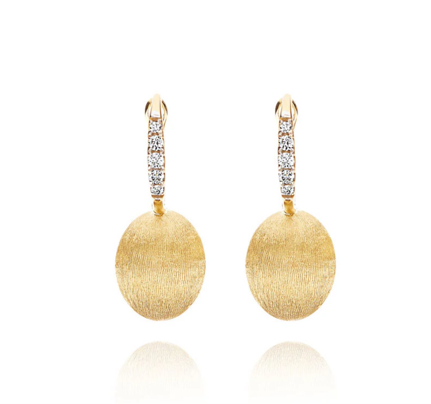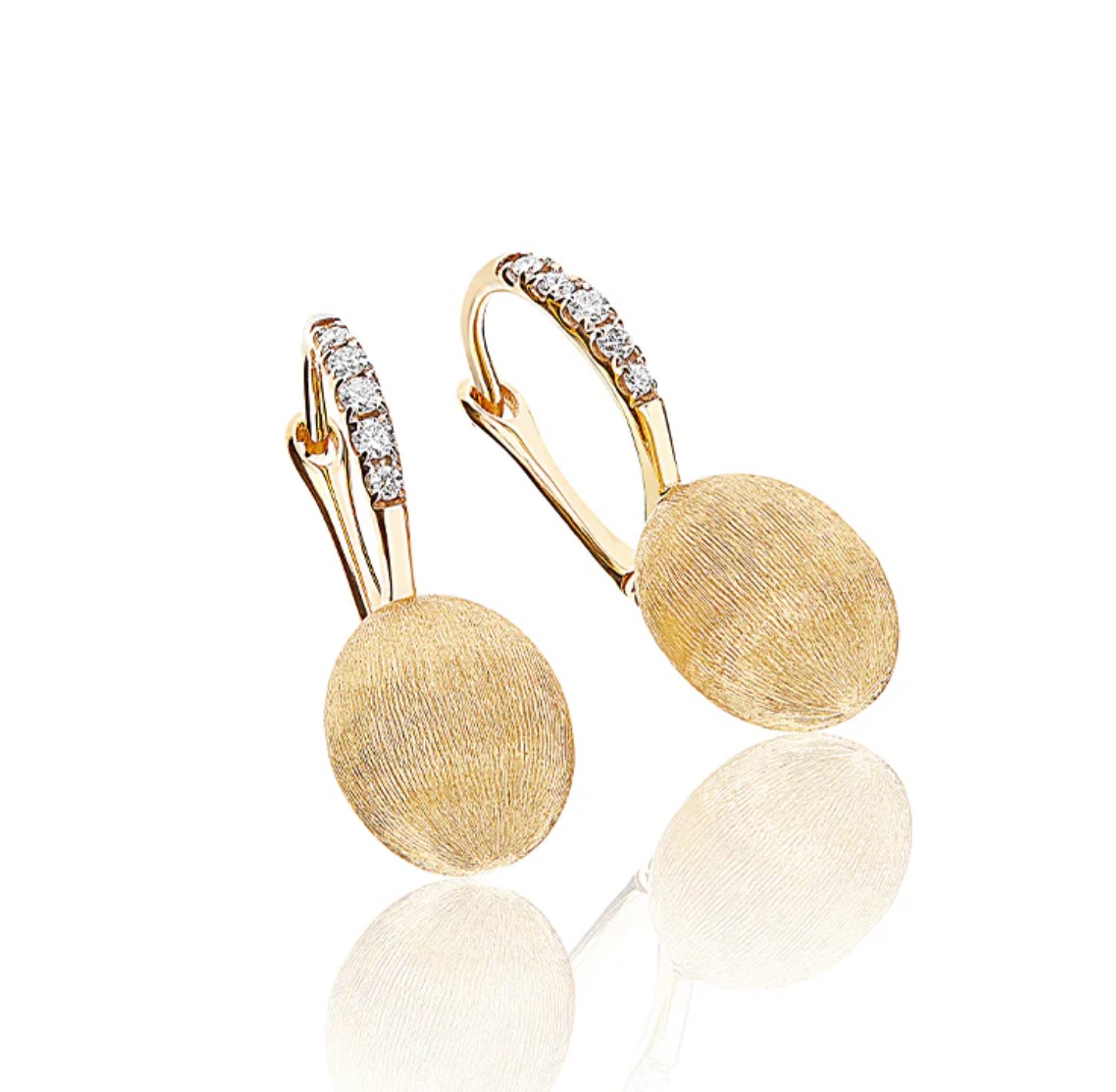 Eleganti orecchini “Ciliegine” in oro giallo 18kt e diamanti. La superfice satinata crea insieme ai diamanti un prodigioso gioco di luci, perfetto per un look tanto elegante quanto casual.