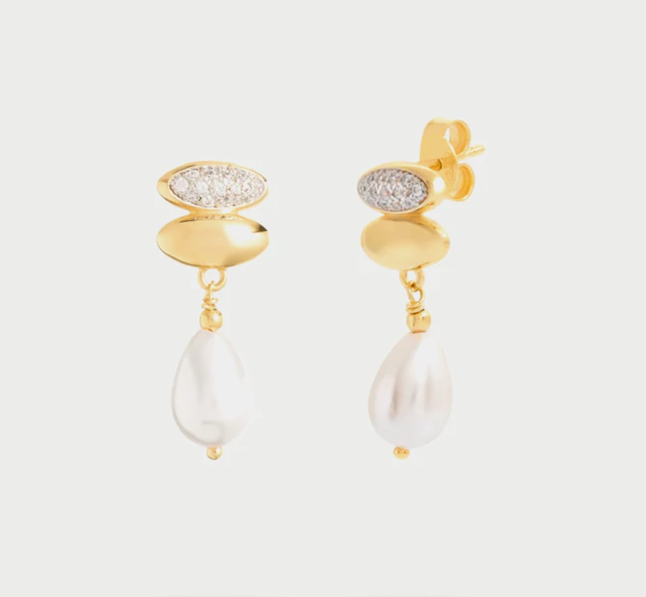 Coppia di orecchini con doppia ellissi lisci e in pavè di zirconi e pendente perla