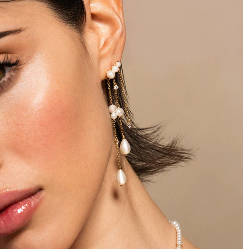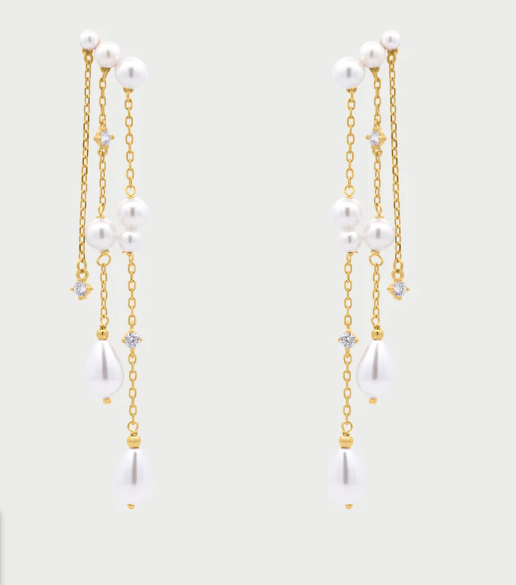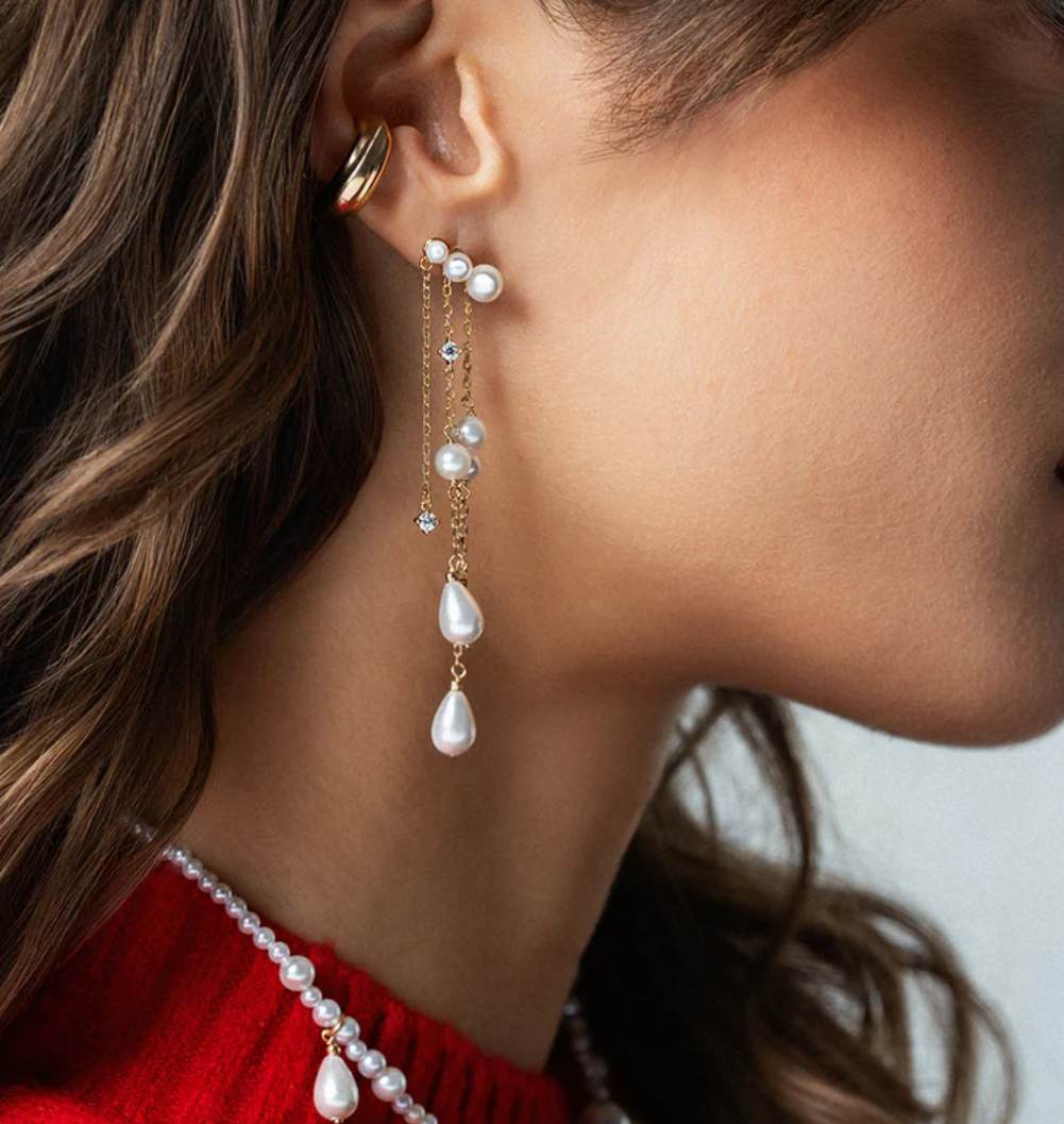 Orecchini in argento 925 e perle di madreperla, con tre fili di perle e zirconi a scalare, design moderno e asimmetrico, rifinito a mano