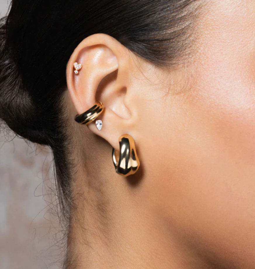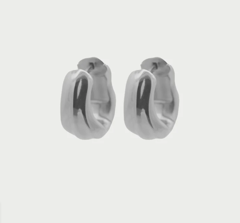 Orecchini a scattino con texture a onda. In lega RDM con finitura oro 18 kt giallo o rodio. Essenziali e luminosi.