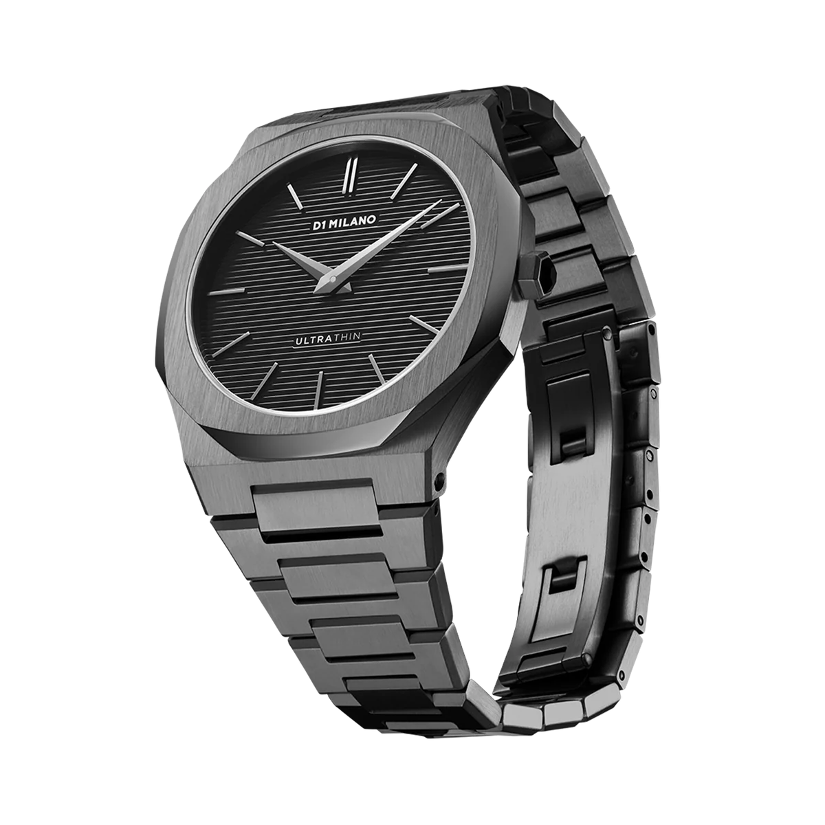 Orologio D1 Milano in acciaio nero con quadrante nero. Orologio D1 Milano con cinturino in acciaio nero e quadrante nero. Misura cassa 40mm X 6mm. Materiale cassa acciaio inossidabile 316L, spazzolato e lucidato. Chiusura con fibbia farfalla nascosta. Vetro zaffiro antiriflesso. Movimento Citizen Miyota 1L22, al quarzo. 5 ATM. Garanzia 2 anni.