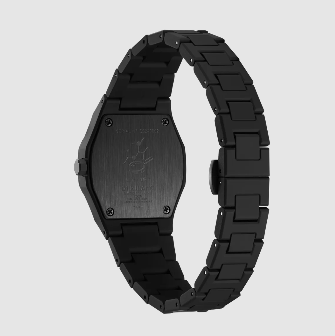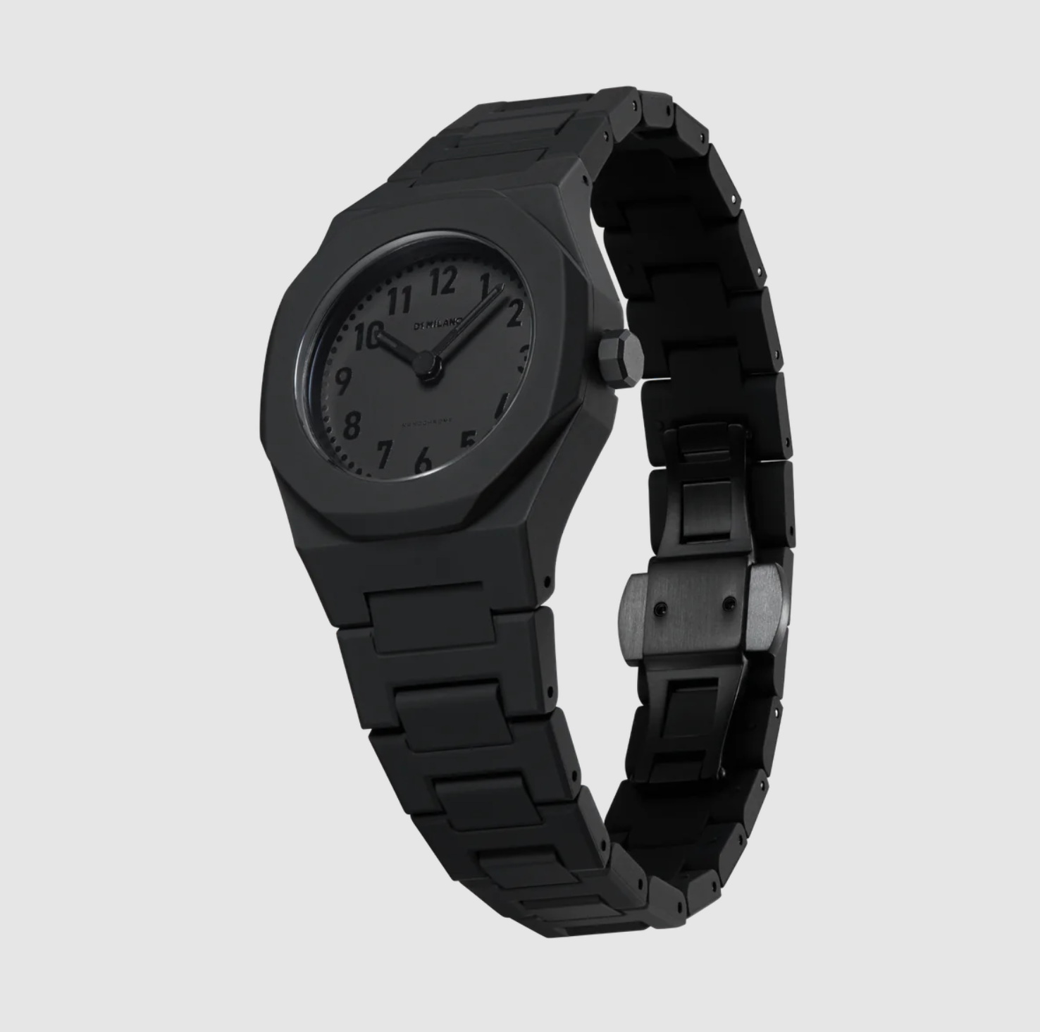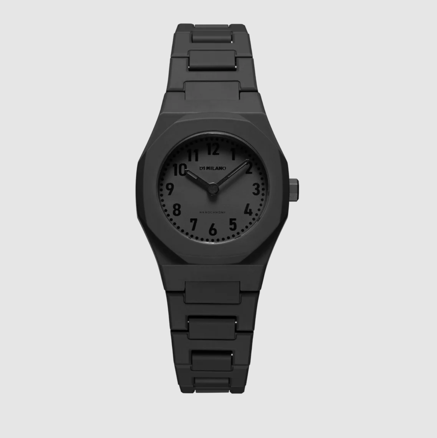 D1 Milano svela il suo ultimo modello in policarbonato, un dinamico 32 mm con una cassa e un bracciale completamente monocromatici in nero. Realizzato per i giovani, questo orologio presenta un rivestimento soft touch per un tocco extra di comfort e un quadrante progettato per massima leggibilità, con gli indici numerici che occupano il centro della scena.