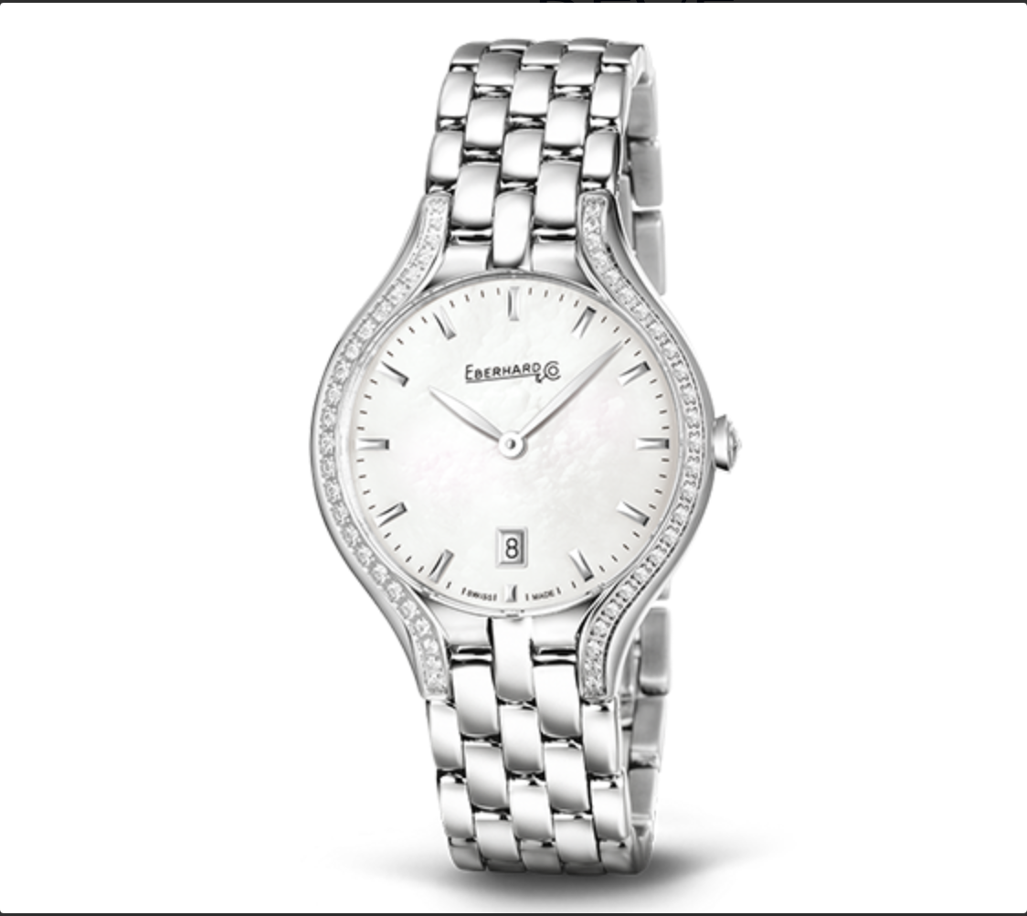 Orologio Eberhard della linea “Rêve” movimento al quarzo acciaio. Vetro zaffiro con trattamento antiriflesso sulla superficie interna. Corona a vite personalizzata. Fondo serrato da 4 viti personalizzato con l’incisione “tout commence par un Rêve”. Bracciale in acciaio. Lunetta con 50 brillanti .Quadrante in madreperla con indici. Lancette a foglia, lucide, rodiate.