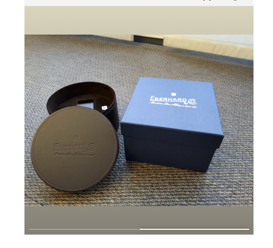 Eberhard Aiglon Grande Taille, solo tempo meccanico a carica automatica cassa in acciaio, vetro zaffiro antiriflesso, corona acciaio a vite personalizzata, fondo serrato da 6 viti personalizzato, cinturino in struzzo marrone con chiusura ad ardiglione, fibbia acciaio personalizzata, quadrante tabacco dégradé, indici applique con punti luminescenti, lancette ore e minuti tipo baton con luminescenza. Diametro 41mm, impermeabilità 5atm distanza anse 20mm
